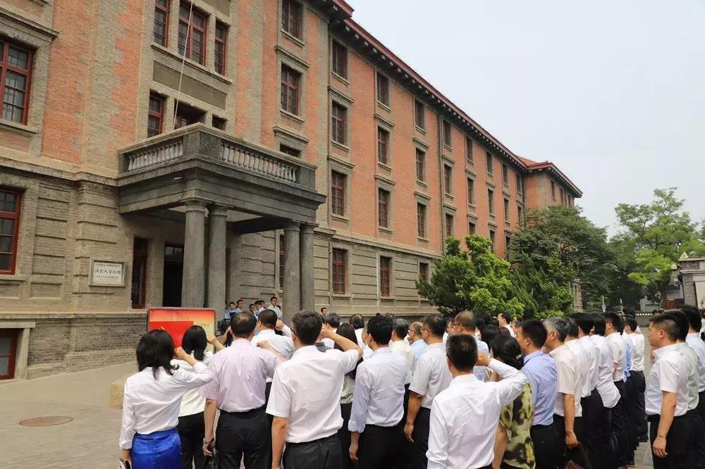 北京國資公司中層以上管理人員在北大紅樓前重溫入黨誓詞。
