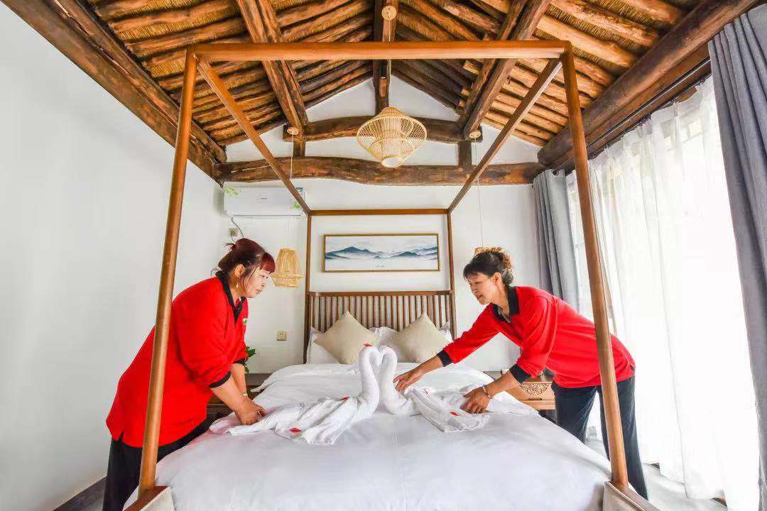 剛才提到的孫大姐,現(xiàn)在如愿地有了穩(wěn)定的工作——創(chuàng)藝鄉(xiāng)居精品民宿管家,經(jīng)過(guò)培訓(xùn),她已經(jīng)可以在5分鐘內(nèi)換好床單、被罩、枕芯所有床品,還會(huì)把毛巾疊出栩栩如生的小動(dòng)物。她說(shuō),以前總覺得自己低人一頭,現(xiàn)在有了穩(wěn)定工作送到咱家門口,有了份工作,收入不僅翻了倍,而且活的更有價(jià)值和尊嚴(yán)了。