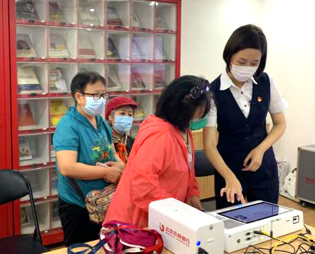 黨員們?yōu)轶A站老年人現(xiàn)場激活養(yǎng)老助殘卡