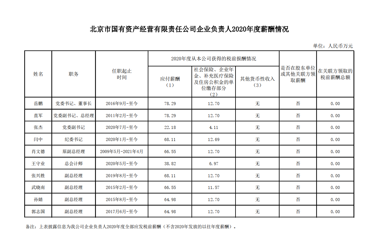 北京國資公司2020年度企業(yè)負責(zé)人薪酬信息公開