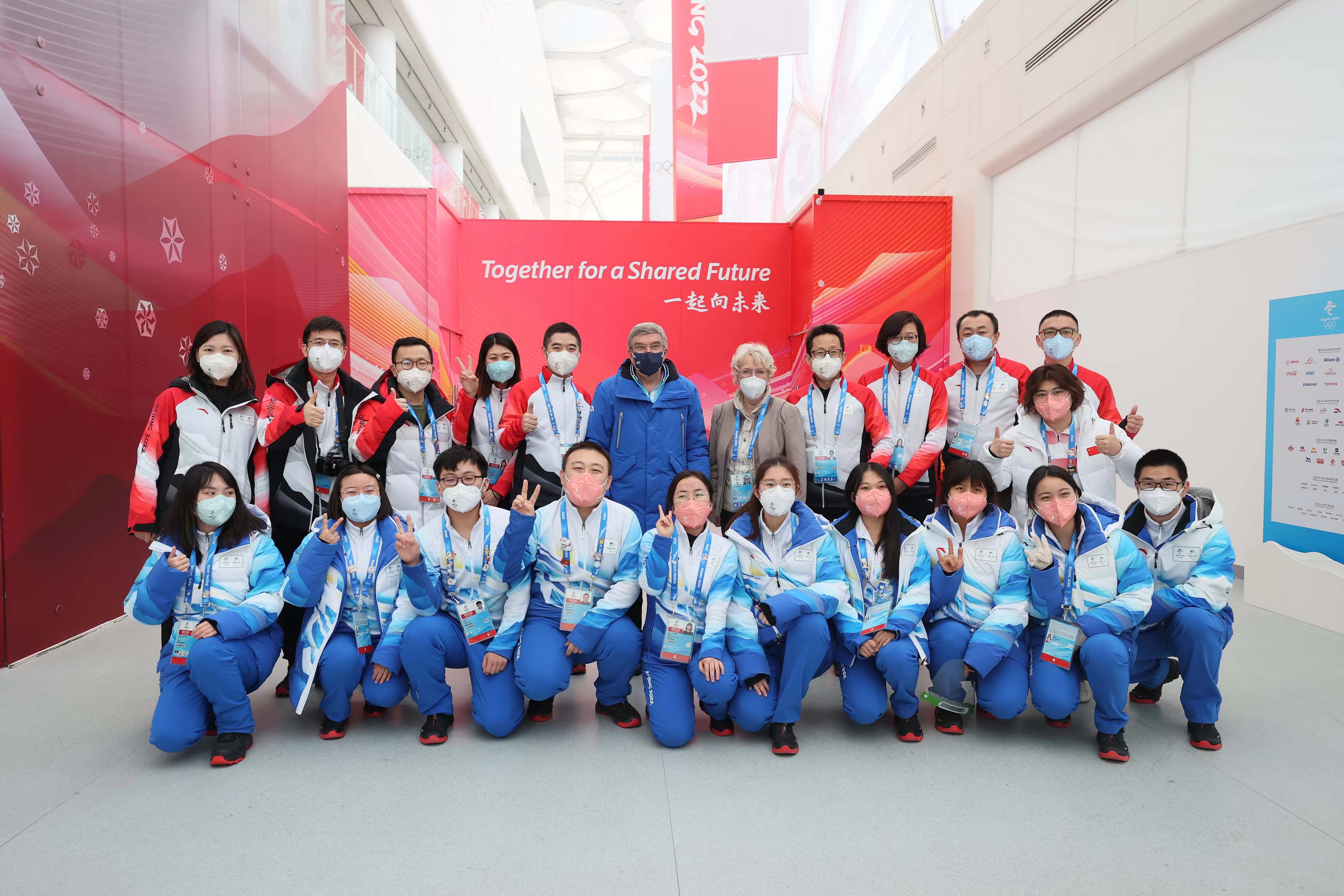 圖說:國(guó)際奧委會(huì)主席托馬斯·巴赫、世界壺聯(lián)主席凱特·凱斯尼斯與國(guó)家游泳中心場(chǎng)館運(yùn)行團(tuán)隊(duì)工作人員合影
