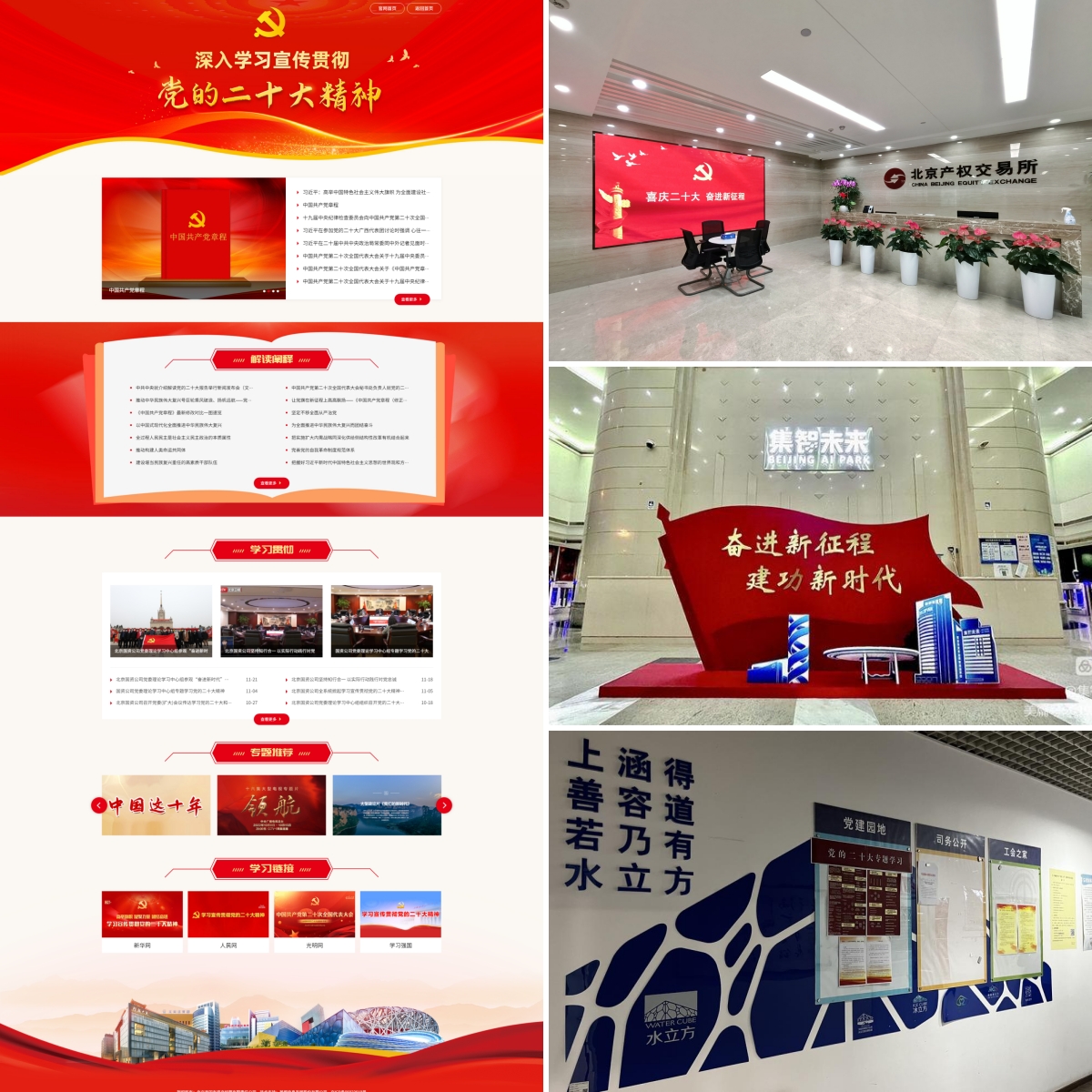 五是聚焦?fàn)I造氛圍帶動(dòng)學(xué)。公司黨委充分利用公司官網(wǎng)、微信公眾號(hào)、OA辦公平臺(tái)、國(guó)資通APP等宣傳陣地,設(shè)計(jì)推出“學(xué)習(xí)宣傳貫徹黨的二十大精神”專題頁(yè)面和專欄,及時(shí)推送權(quán)威學(xué)習(xí)內(nèi)容,生動(dòng)展示各級(jí)黨組織和廣大黨員學(xué)習(xí)貫徹黨的二十大精神的情況。北京產(chǎn)權(quán)交易所黨委、國(guó)家體育場(chǎng)公司黨委等在公司門戶網(wǎng)站、宣傳展示屏、辦公場(chǎng)所宣傳欄等宣傳陣地布置展示學(xué)習(xí)黨的二十大精神的宣傳內(nèi)容,積極營(yíng)造“喜慶二十大,奮進(jìn)新征程”的熱烈氛圍。國(guó)家游泳中心公司黨總支充分利用辦公區(qū)黨建展板打造黨的二十大專題學(xué)習(xí)“微陣地”,圖文并茂地展示了黨的二十大報(bào)告等內(nèi)容。集智未來(lái)公司黨支部在園區(qū)大廳設(shè)置“奮進(jìn)新征程 建功新時(shí)代”主題立體展板,成為園區(qū)企業(yè)支部活動(dòng)“網(wǎng)紅”打卡點(diǎn)。北京再擔(dān)保公司黨總支、國(guó)苑公司黨支部等通過黨支部微信群、公司黨建微信公眾號(hào)推送黨的二十大精神學(xué)習(xí)資料,發(fā)布黨組織學(xué)習(xí)動(dòng)態(tài),推動(dòng)黨的二十大精神學(xué)習(xí)走深走實(shí)。