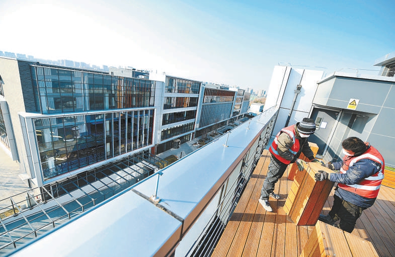 臨近春節(jié),南海子體育休閑產業(yè)園項目即將竣工,園區(qū)正在做最后的施工沖刺,工人師傅在建筑屋頂露臺布置、裝修。 本報記者 和冠欣攝