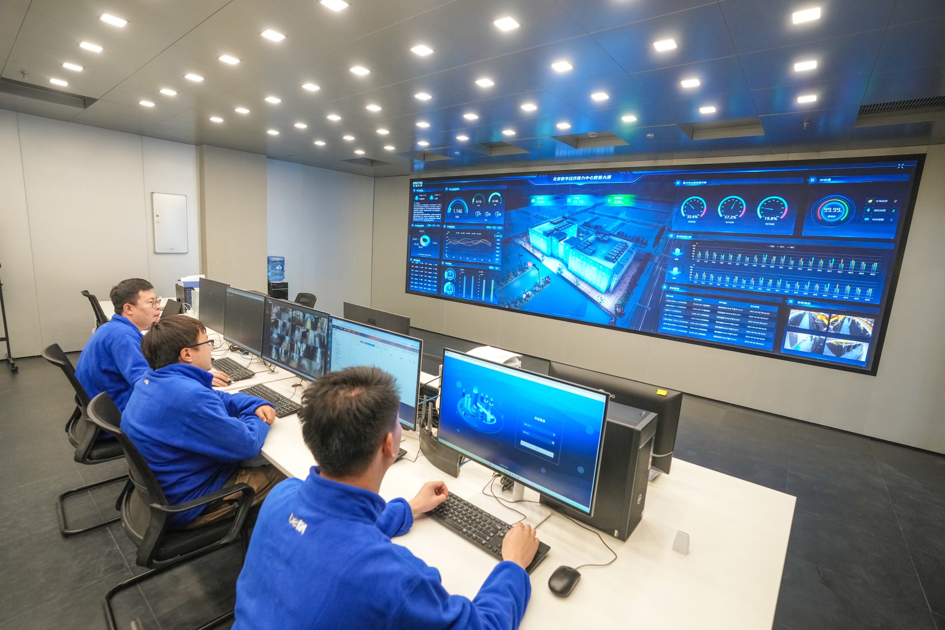 北京數(shù)字經(jīng)濟(jì)算力中心內(nèi),工作人員在查看中心各項(xiàng)運(yùn)轉(zhuǎn)數(shù)據(jù)。